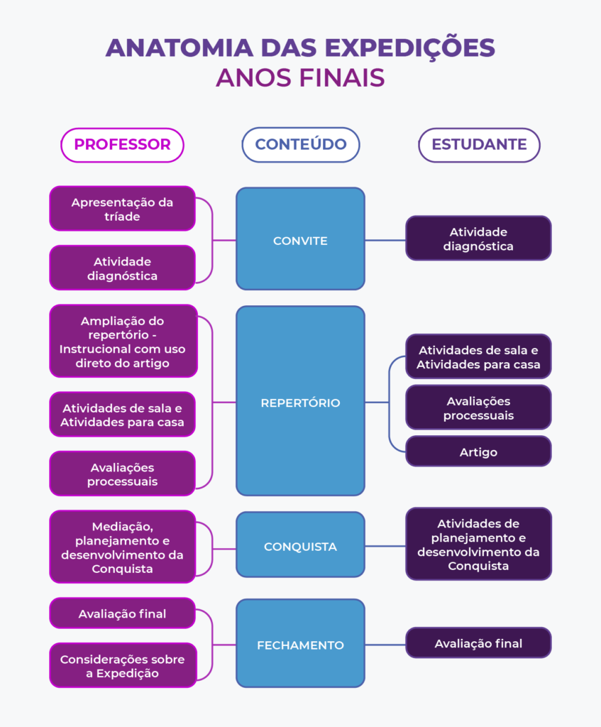 As especificidades de cada componente são contempladas ao mesmo tempo em que as Expedições cobrem a carga horária e o número de aulas semanais de cada disciplina. Cada Expedição de Ensino Fundamental – Anos finais é composta por: