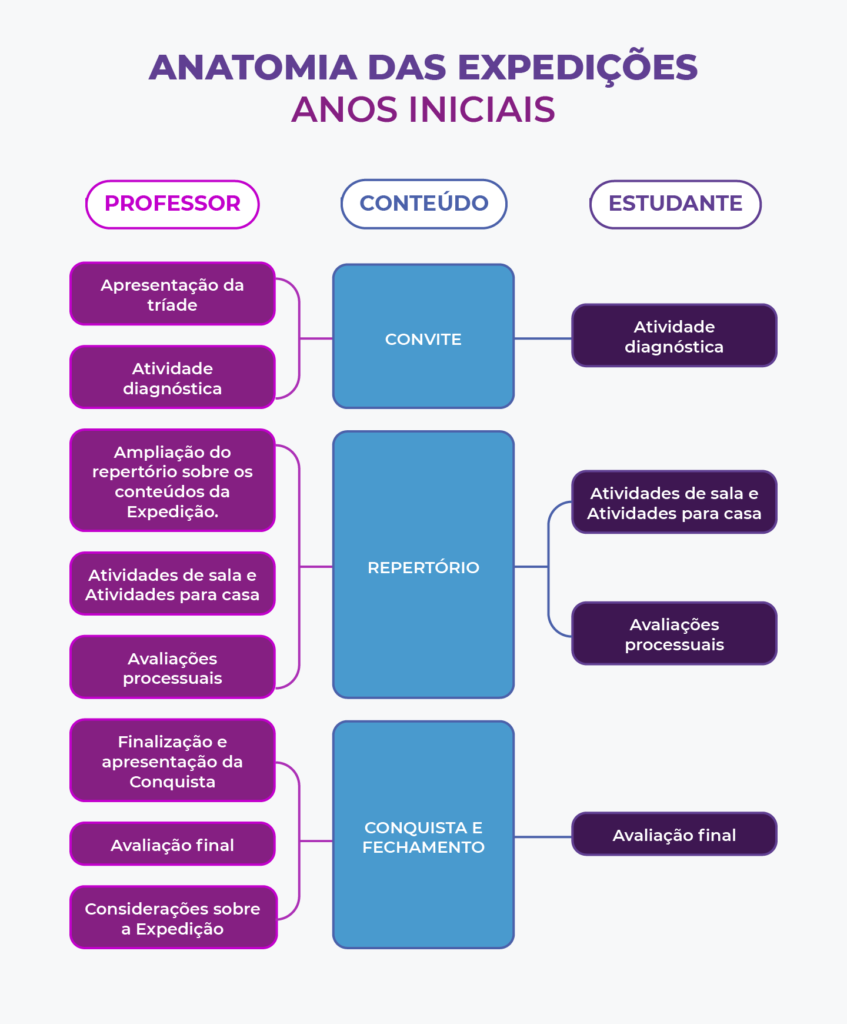As Expedições contêm conteúdo didático multimodal, atividades e avaliações voltadas aos estudantes. Além disso, há um conteúdo instrucional voltado para os professores com orientações didáticas e de mediações do processo de aprendizagem. Com este material é possível o acompanhamento mais preciso do processo de aprendizagem — tanto pelo estudante quanto pelos familiares e professores — trazendo mais clareza, consistência e constância para os envolvidos.